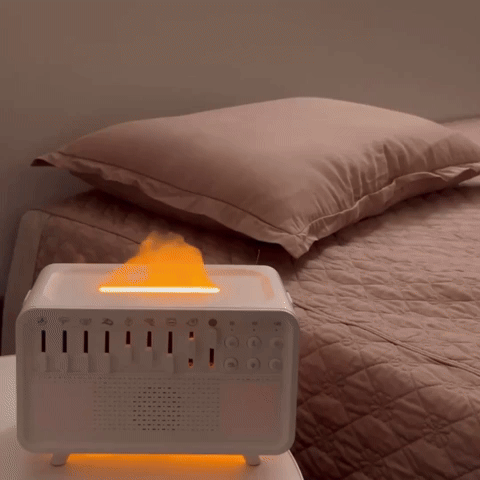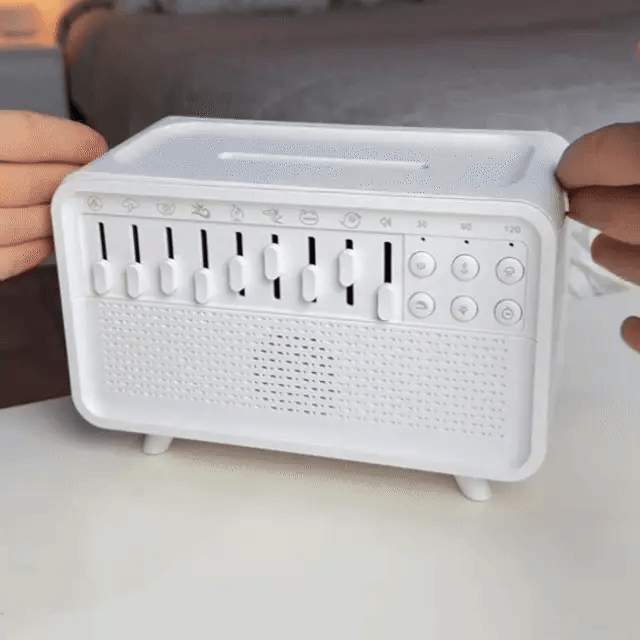 The device creates soothing sounds inspired by nature — like rain, ocean waves, and gentle wind — helping your mind relax and fall asleep faster after a long day.